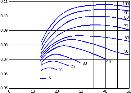 Współczynniki geometrii, I, dla przekładni stożkowych z kołami o zębach krzywoliniowych. Kąt nacisku = 20 stopni, kąt pochylenia zęba = 35 stopni, kąt osi = 90 stopni.