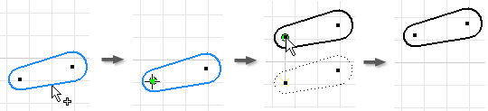 Podczas kopiowania lub przesuwania geometrii w szkicu programu Inventor można wybrać co najmniej jeden element, a następnie zdefiniować punkt bazowy nowego położenia geometrii. Aby obrócić geometrię, należy wybrać elementy, a następnie określić punkt środkowy.