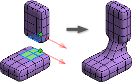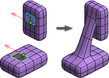 Polecenie Pomost łączy bryły lub tworzy otwory w modelu swobodnym. Edycja bryły swobodnej z pomostem pozwala tworzyć gładkie połączenia poprzez określenie powierzchni lub krawędzi do połączenia.