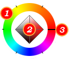 Koło kolorów Koło kolorów składa się z trzech komponentów podrzędnych: 1) koła barw, 2) rombu i 3) suwaka bocznego (cienki czarny pasek).