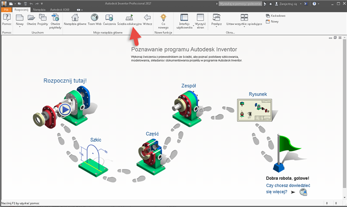 Ćwiczenia z przewodnikiem zawarte w produkcie to doskonały sposób na rozpoczęcie pracy. Ten zestaw podstawowych ćwiczeń pokazuje pełen proces roboczy od podstawowego szkicowania do dokumentowania projektu. Dostęp do tych ćwiczeń można uzyskać, klikając ścieżkę edukacyjną na karcie Rozpocznij w panelu Moje narzędzia główne na wstążce.