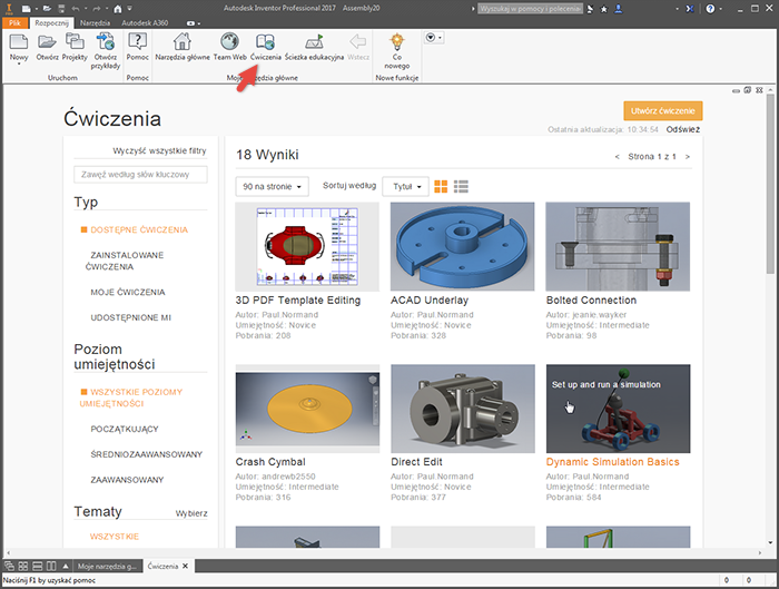 Uwaga: Ćwiczenia z przewodnikiem nie są dostępne w programie Inventor LT.