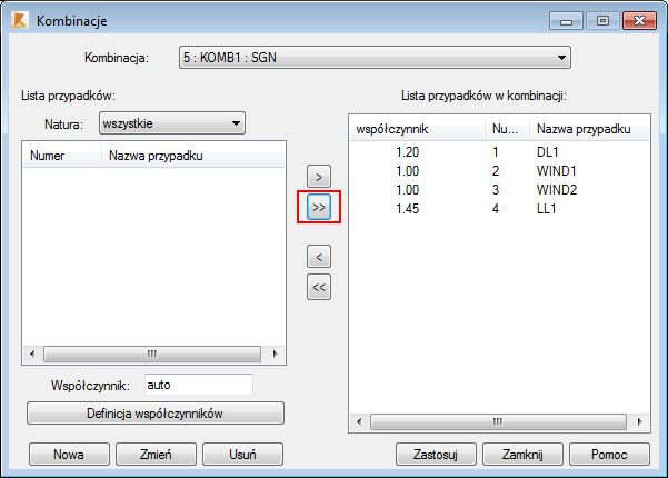 , aby przenieść wszystkie zdefiniowane przypadki obciążeń z lewego panelu do listy przypadków w kombinacji w prawym panelu.