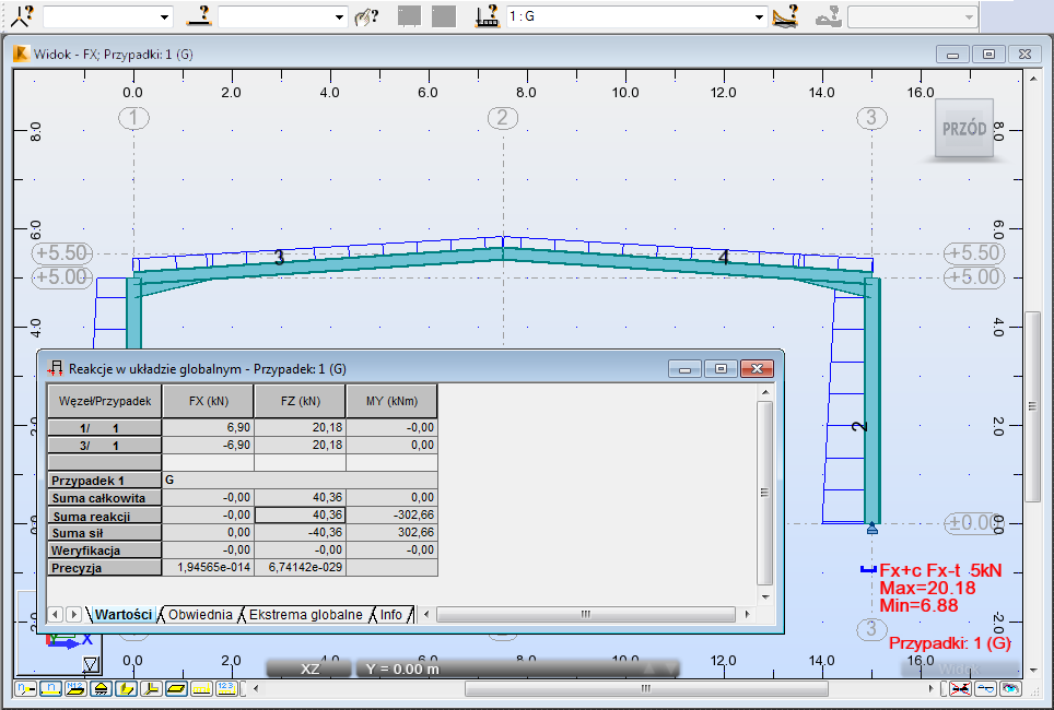 - Otworzyć układ Wyniki i wyświetlić informacje o konstrukcji w postaci graficznej (wykresy). Uwzględniany jest na nich wpływ sił, nacisków i reakcji.