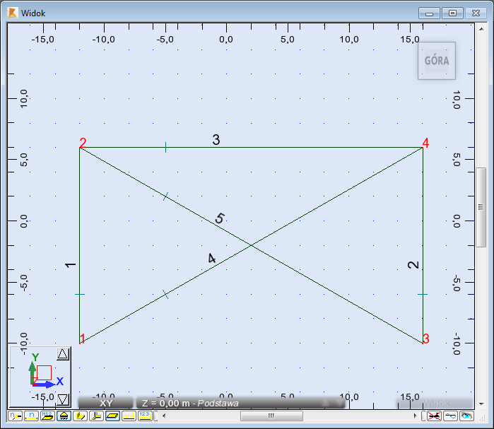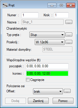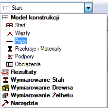 Układ jest podzielony na trzy części: Widok, okno dialogowe Pręty i tabelę Pręty.