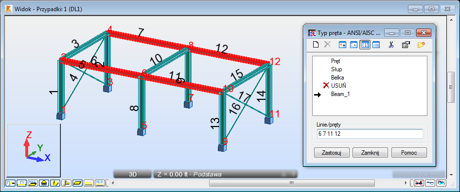 Możesz również umieścić kursor w polu Linie /pręty, a następnie przejść do obszaru rysunku i przytrzymać klawisz Ctrl, aby wybrać belki o numerach 6, 7, 11 i 12.