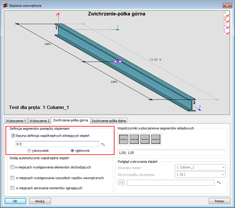 Kliknij przycisk Półka górna, a następnie w oknie dialogowym Współczynnik długości zwichrzeniowej kliknij opcję (Stężenia pośrednie).