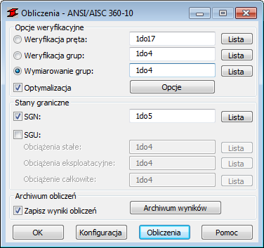 Podczas obliczeń program spróbuje znaleźć najlżejszy przekrój w grupie przekrojów, który spełnia zdefiniowane kryteria normy.