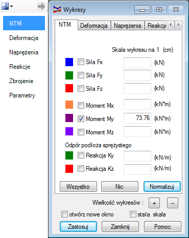 Przejdź do karty NTM w oknie dialogowym Wykresy, wybierz opcję Moment MY i kliknij przycisk Normalizuj.