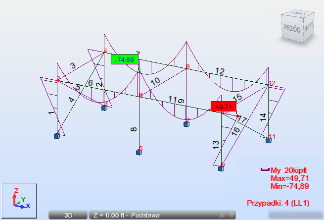 W widoku wyświetlane są wykresy momentu gnącego dla wszystkich belek, tak jak pokazano poniżej.