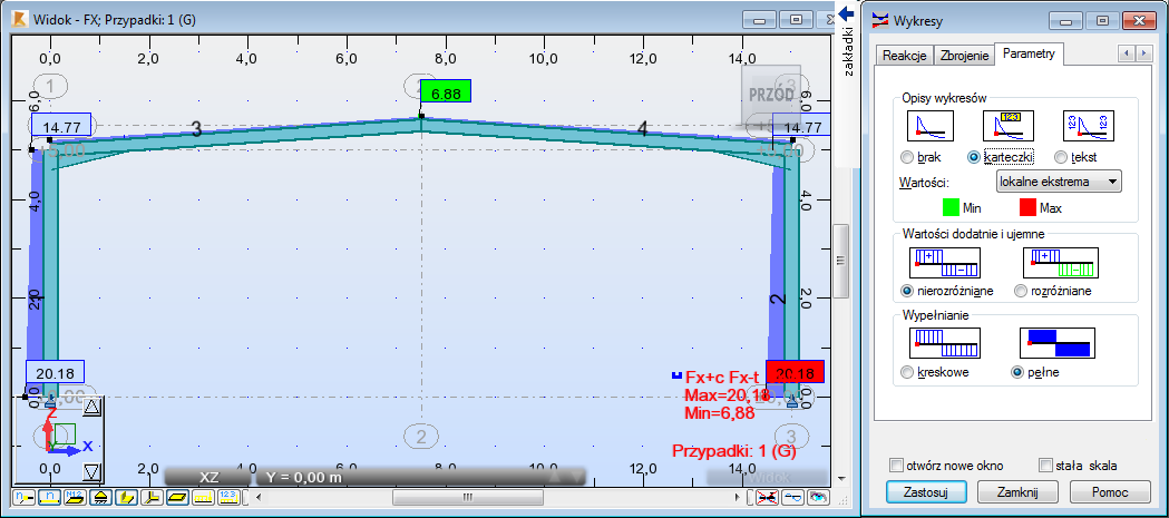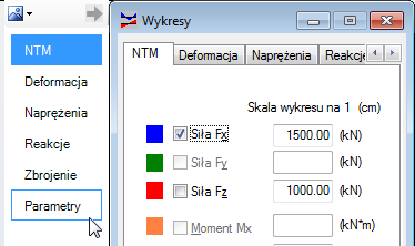 W oknie dialogowym Wykresy można określić informacje, które mają być wyświetlane, z uwzględnieniem sił wewnętrznych (NTM), odkształceń, naprężeń, reakcji i zbrojenia.