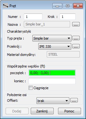 Uwaga: W tym miejscu, lub po zdefiniowaniu geometrii, można zmienić typ pręta z prostego na inny, np. słup lub belka.