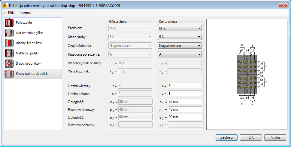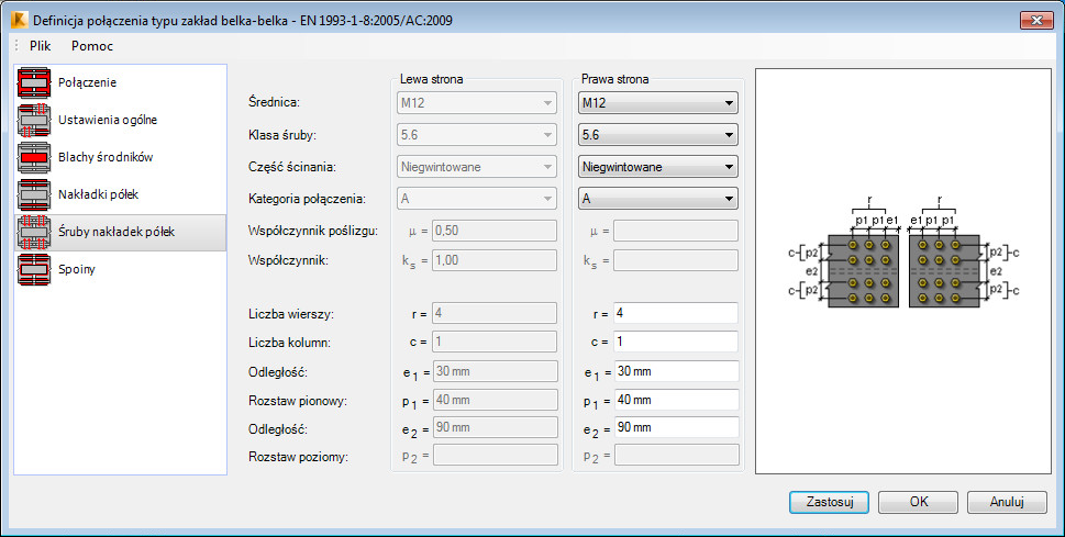 Użyj panelu śrub nakładki półki, aby określić parametry śrub łączących nakładkę z półkami pręta.