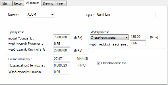 - Współczynnik tłumienia — współczynnik tłumienia definiowanego aluminium (jest to tłumienie materiałowe określane dla potrzeb analiz dynamicznych konstrukcji).