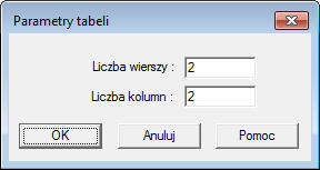 W oknie dialogowym Parametry tabeli przedstawionym poniżej możliwe jest określenie liczby wierszy i kolumn, które tworzą definiowaną tabelę. To okno dialogowe jest otwierane przez: