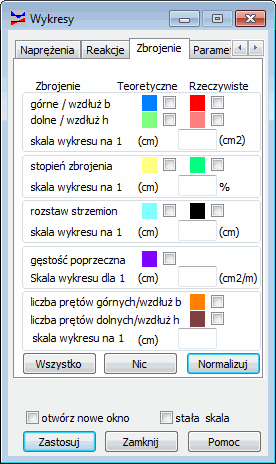 Użyj tego okna dialogowego, aby wybrać wielkości, dla których chcesz wyświetlić wykresy prętów konstrukcji.