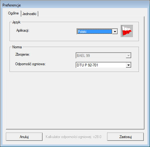 Na karcie Ogólne w oknie dialogowym Preferencje można wybrać język wyświetlania kalkulatora odporności ogniowej.