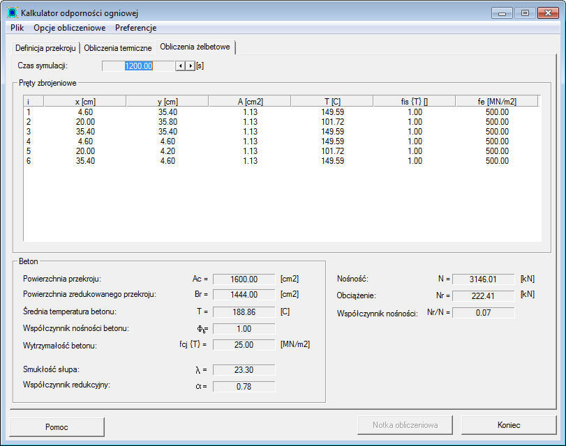Wyniki obliczeń żelbetowych są wyświetlane dla każdego kroku czasowego.