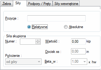 Domyślnie współrzędne położenia sił są podawane w jednostkach relatywnych. Możliwe jest wpisanie wielu sił dla tej samej współrzędnej w ramach jednego przypadku obciążeniowego.