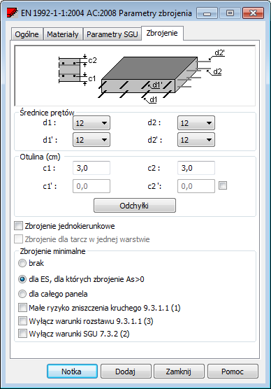 Określ następujące kryteria generowania zbrojenia minimalnego w panelach żelbetowych: