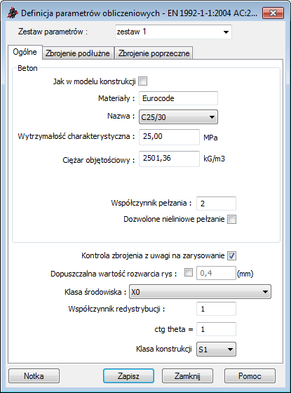 Definicja parametrów obliczeń — karta Ogólne (Eurocode 2)