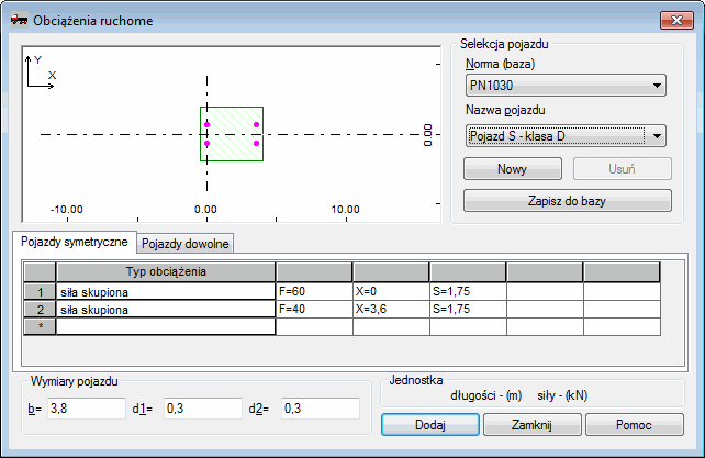 Na definicję pojazdu mogą się składać siły skupione, liniowe lub powierzchniowe o prostokątnym konturze.