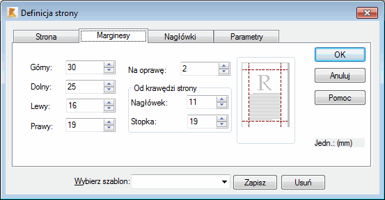 Po wyborze karty Marginesy w oknie dialogowym Układ strony pojawiają się opcje umożliwiające ustawienie marginesów strony: górny , dolny , lewy , prawy i margines pozostawiany na oprawę oraz w jakiej odległości od krawędzi strony mają się rozpoczynać nagłówki i stopki. Wszystkie wielkości podawane są w milimetrach.
