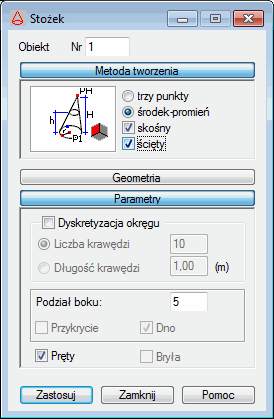 - Przykrycie — włączenie tej opcji powoduje, że w trakcie definiowania stożka tworzona będzie również ścianka obiektu będąca jego przykrycie. Opcja dostępna jest jedynie dla stożka ściętego.
