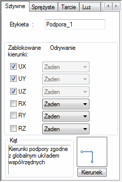 W prawym dolnym rogu okna przedstawiany jest schematyczny rysunek definiowanej podpory. Pod rysunkiem znajduje się przycisk Kierunek; jego naciśnięcie powoduje otwarcie okna dialogowego Kierunek podpory, w którym zdefiniowany może zostać kierunek lokalnej osi x podpory (poprzez skierowanie go do punktu, węzła lub obrócenie podpory względem dowolnej osi globalnego układu współrzędnych). Po naciśnięciu przycisku Dodaj zdefiniowana podpora zostanie dopisana do aktywnej listy podpór.