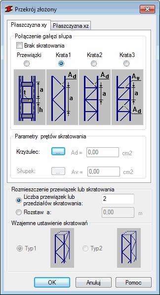 Założono, że odpowiednie płaszczyzny przewiązek (skratowania) są równoległe do lokalnych osi przekroju wielogałęziowego (x — oś podłużna pręta, y — oś pozioma, z — oś pionowa). Na karcie Płaszczyzna XY istnieje możliwość zdefiniowania typów przewiązek lub skratowania leżących w płaszczyźnie równoległej do lokalnej osi y. Analogicznie na karcie Płaszczyzna XZ definiowane będą parametry przewiązek lub skratowania leżących w płaszczyźnie równoległej do lokalnej osi z. Włączenie opcji Brak skratowania powoduje, że w obliczeniach nie jest uwzględniana ‘wielogałęziowość’ i obliczenia przeprowadzane są przy założeniu pełnego zespolenia gałęzi w danej płaszczyźnie.