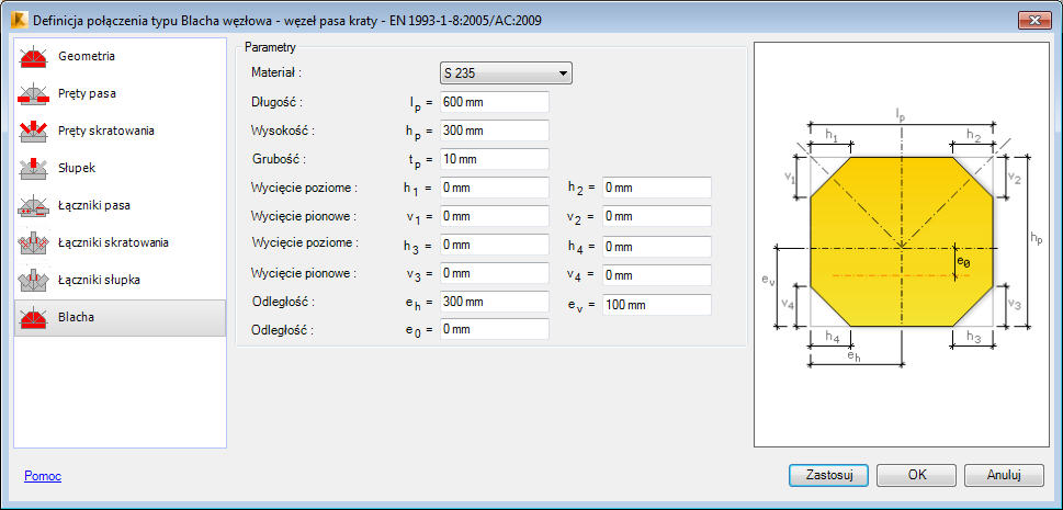 Opcje znajdujące się na tej zakładce umożliwiają definicję parametrów geometrycznych blachy węzłowej; na tej zakładce dokonany może również wybór materiał, z którego blacha ma zostać wykonana.
