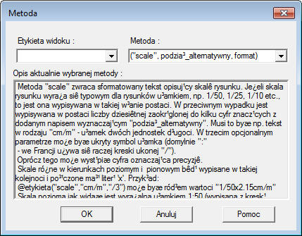 Okno dialogowe Metoda przybiera formę przedstawioną na rysunku poniżej. Zawiera listę dostępnych metod wraz z odpowiednimi opisami. Ponadto, należy określić etykietę widoku, do którego zostanie zastosowana metoda.