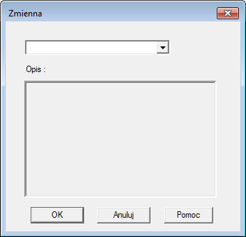 Okna dialogowe dla zmiennych i funkcji są identyczne. Zawierają one listę dostępnych zmiennych lub funkcji wraz z opisem wybranej zmiennej/funkcji. Można również dodać zmienną (funkcję), która nie znajduje się na liście. Po naciśnięciu przycisku <Enter> tekst zostanie wstawiony w miejscu, gdzie został ustawiony kursor w polu Wyrażenie na karcie Właściwości w oknie dialogowym Właściwości tekstu.