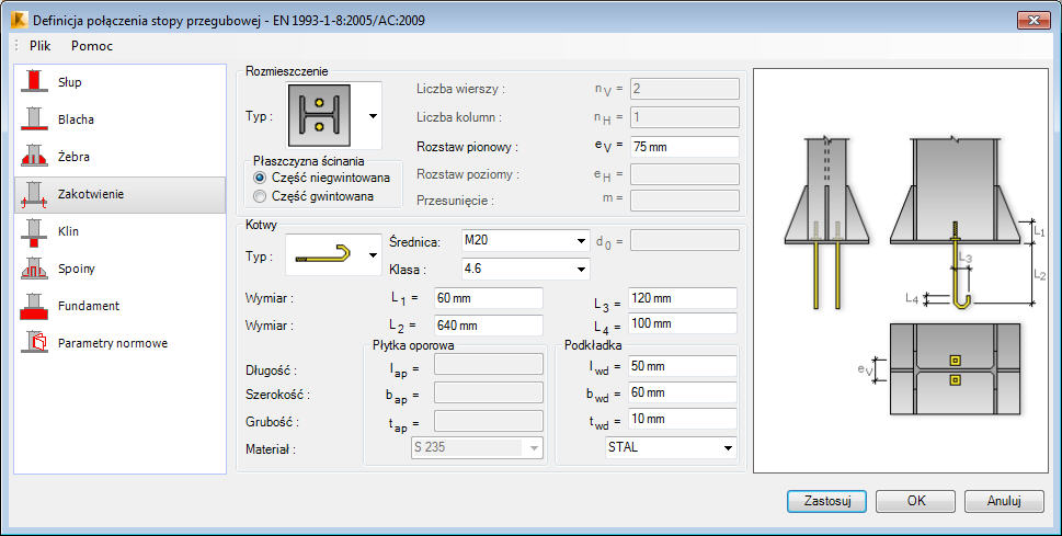 Opcje znajdujące się w polu Kotwy pozwalają na definicję parametrów śrub kotwiących. W polu Typ można wybrać jeden spośród 4 rodzajów śrub kotwiących oraz zdefiniować średnicę śruby i materiał, z którego zostanie wykonana. Pola dotyczące wymiarów kotwy (L1, L2, L3 i L4) pozwalają na definicję długości poszczególnych odcinków śruby. Parametry płytek oporowych i podkładek pod śruby kotwiące należy definiować w polach Płytka oporowa i Podkładka.