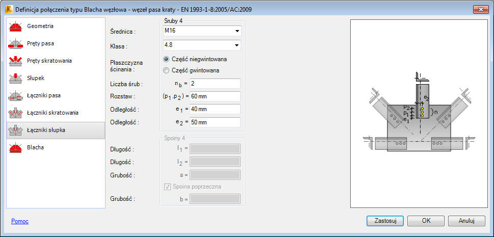 - parametrów spoin użytych do połączenia pręta z blachą węzłową (jeśli dla pręta wybrane jest połączenie spawane).