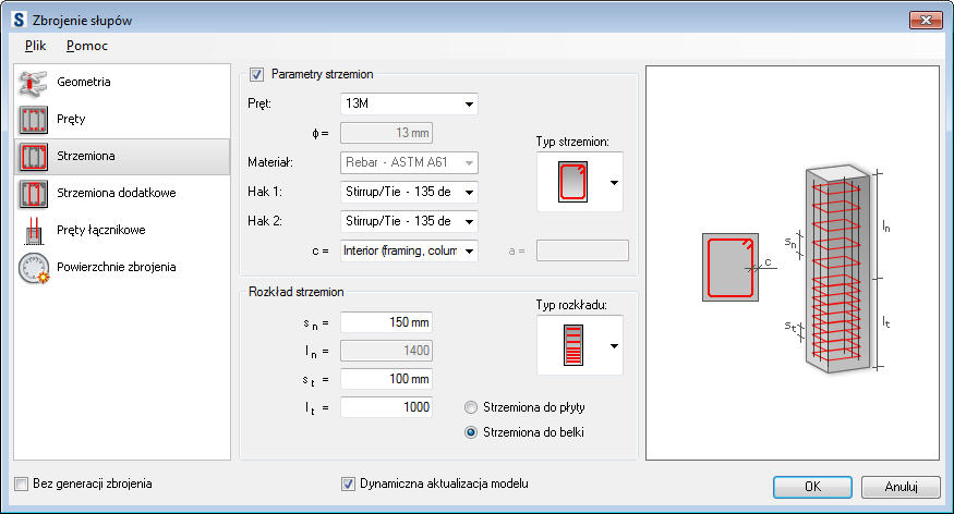 W oknie dialogowym Zbrojenie słupów można zdefiniować parametry zbrojenia poprzecznego (strzemion)