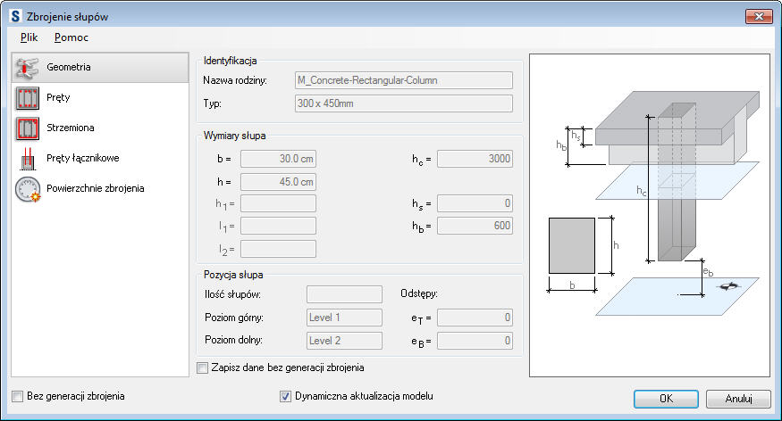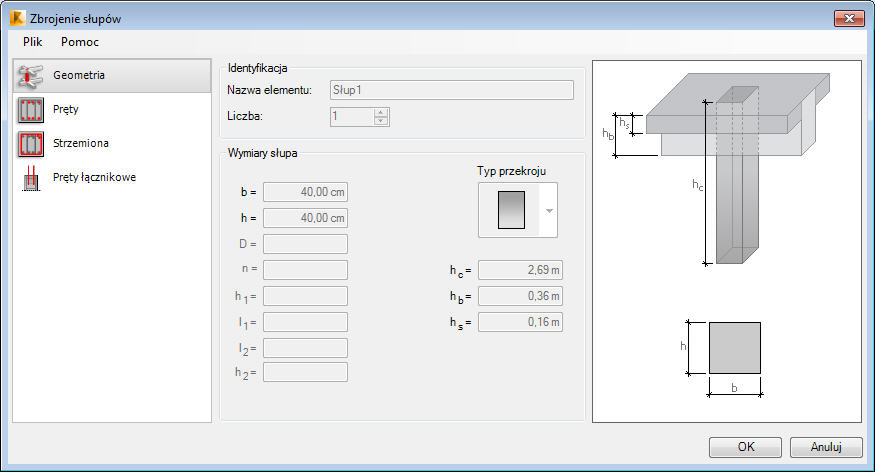 Można zdefiniować inne typy przekrojów słupa (np. przekrój zetowy, przekrój półkolisty itp.), ale zbrojenie słupa nie jest generowane dla tych typów przekrojów.