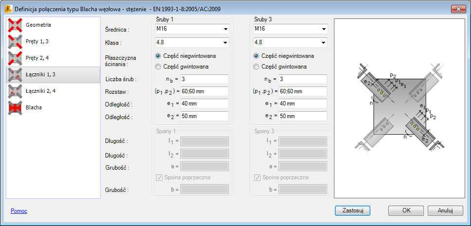 - parametrów spoin użytych do połączenia pręta z blachą węzłową (jeśli dla pręta wybrane jest połączenie spawane).