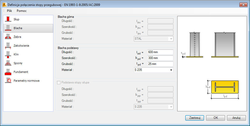 Na zakładce Blacha możliwa jest definicja podstawowych parametrów geometrycznych: