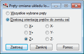 - Dostosuj orientację prętów do osi — wybranie tej opcji powoduje, że dostępne stają się opcje znajdujące się w dolnej części okna dialogowego; Jeśli jeden z nich zostanie wybrany, to zwrot lokalnej osi x wybranych prętów ulegnie zmianie. Na przykład w przypadku wybrania opcji Z+ oś x lokalnego układu pręta będzie zwrócona ku górze zgodnie ze zwrotem osi Z globalnego układu współrzędnych.