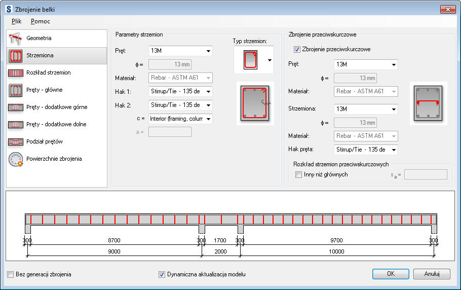 Istnieje kilka parametrów zbrojenia poprzecznego (strzemion) definiowanego w oknie dialogowym Zbrojenie belek: