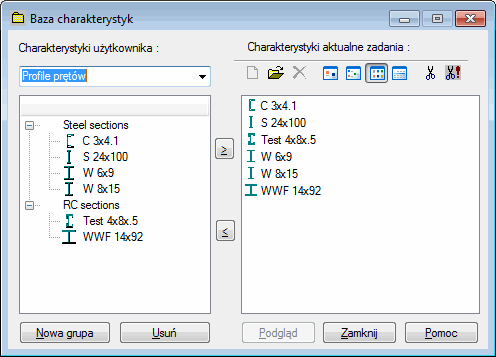 Również, klikając na okien dialogowych używanych do definiowania etykiet (przekroje, podpór wersjach itp.). Baza charakterystyk jest dostępna dla wszystkich typów konstrukcji.