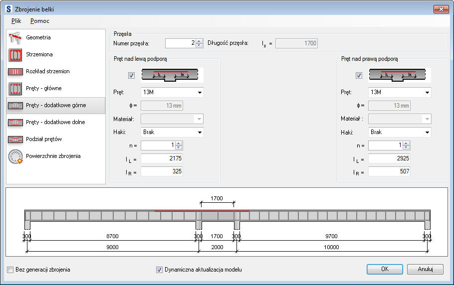 Pręty zbrojeniowe są generowane osobno dla każdego przęsła belki. Parametry prętów dodatkowych górnych obejmują poniższe pozycje: