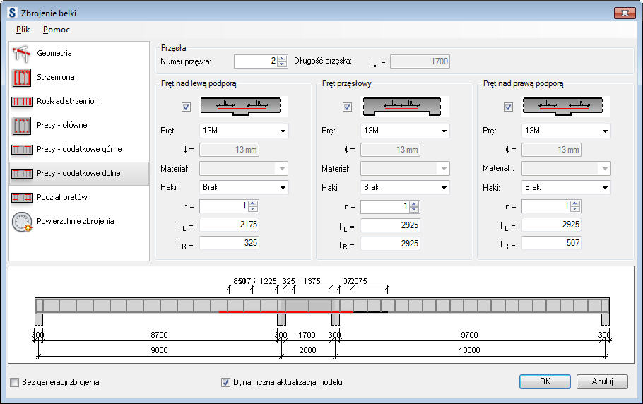 Te pręty zbrojeniowe są generowane osobno dla każdego przęsła belki. Parametry dodatkowych prętów dolnych obejmują poniższe pozycje: