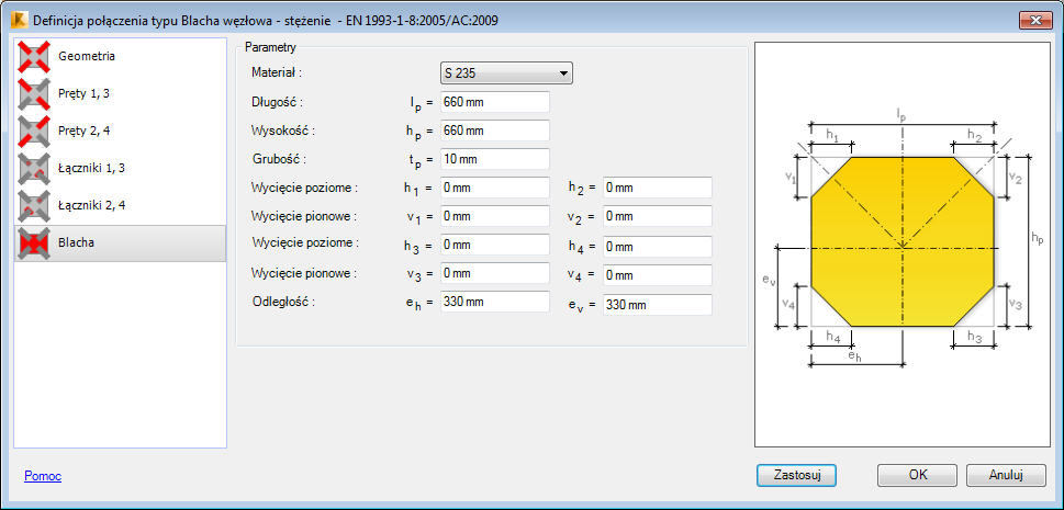 Opcje znajdujące się na tej zakładce umożliwiają definicję parametrów geometrycznych blachy węzłowej; na tej zakładce dokonany może również wybór materiał, z którego blacha ma zostać wykonana.