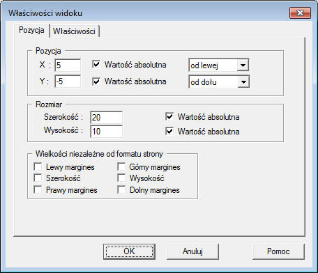 Okno dialogowe składa się z jednej (Położenie — dla właściwości obszaru) lub dwóch kart (Położenie i Właściwości). Karta Położenie zawiera takie same opcje jak karta Położenie w oknie Właściwości tekstu.
