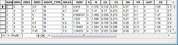 - Podstawowe wymiary przekroju (dim1, dim2, dim3). W zależności od przekroju, jeden lub więcej z tych wymiarów jest wypełniony. Puste wymiary są oznaczone cyfrą 0.