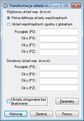 Po kliknięciu opcji Edycja / Transformacja układu współrzędnych otwiera się okno Transformacja układu współrzędnych.