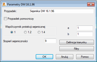 Parametry analizy sejsmicznej konstrukcji zależą od wyboru normy sejsmicznej, która będzie wykorzystywana podczas obliczeń konstrukcji poddanej wpływom sejsmicznym. Po wyborze włoskiej normy sejsmicznej DM 16.1.96 w oknie dialogowym Definicja nowego przypadku lub naciśnięciu klawisza Parametry w oknie Typ analizy na ekranie pojawia się okno dialogowe pokazane poniżej.