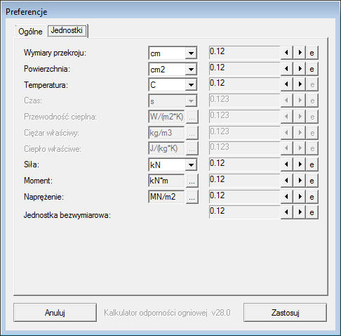 Karta Jednostki w oknie Preferencje pozwala wybrać jednostki używane przez kalkulator odporności ogniowej.